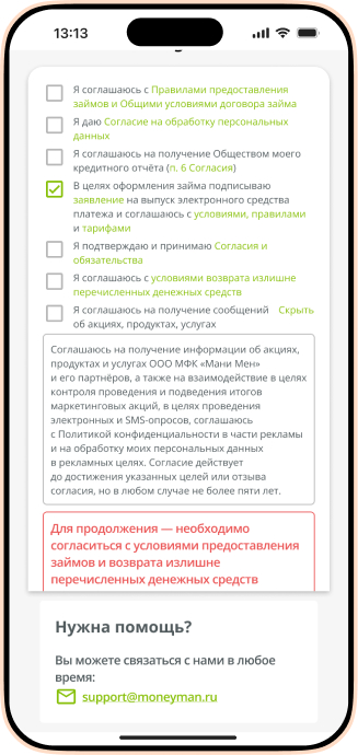 При оформлении нового займа подтвердите согласие на ЭСП и мы откроем для вас кошелек Moneyman.
